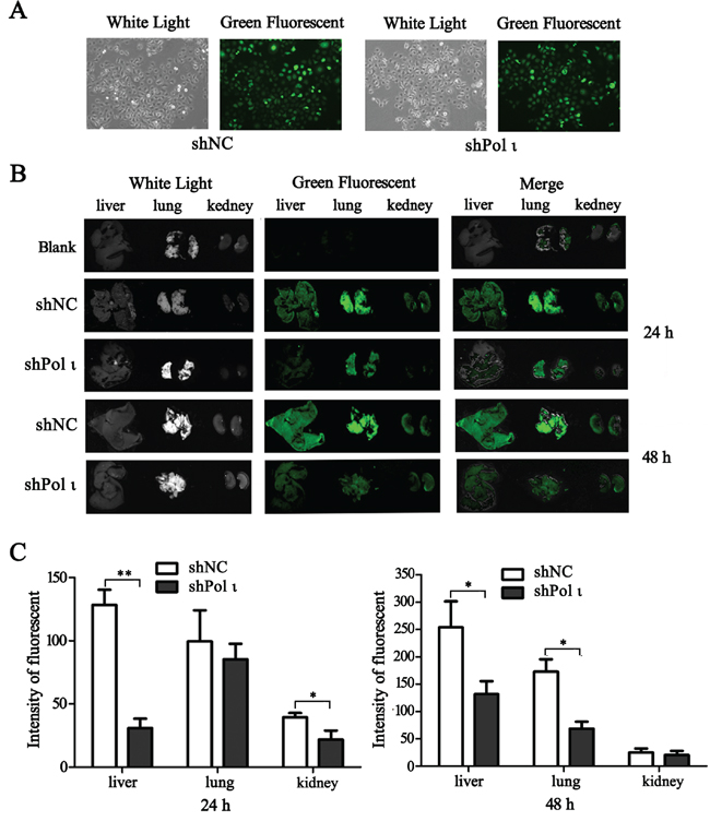 Figure 4: Knockdown of Pol ι expression decreases the colonization of KYSE-150 cells in vivo. A. the particles containing Pol ι shRNA-EGFP vectors were used to infect KYSE-150 cells, and the stable cell lines were selected in medium containing 1μg/ml Puromycin for 7 days. B. cells were injected into nude mice via the tail vein. After 24 or 4 h, the livers, kidneys and lungs of the mice were removed and KYSE-150 cell colonization in the organs was visualized using an in vivo imaging system. All the photos were taken under the same condition. C. relative green fluorescence levels in the indicated group of tissues were calculated using the ImageJ image analysis software (*p < 0.05, **p<0.01, Student’s t test).