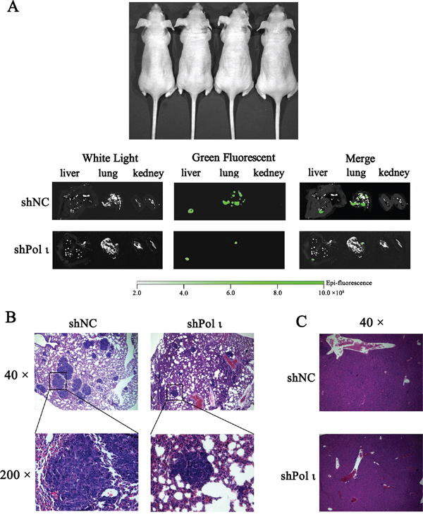 Figure 5: Knockdown of Pol ι expression decreases the metastatic potential of KYSE-150 cells in vivo. Cells were injected into nude mice via the tail vein. A. after 30 days, the livers, kidneys and lungs of nude mice were removed and the metastatic status of transplanted KYSE-150 cells into those organs was evaluated by an in vivo imaging system. B-C. the lungs (B) and livers (C) were fixated in 10% phosphate-buffered formaldehyde and embedded in paraffin. Tumors were confirmed in H&E-stained sections.