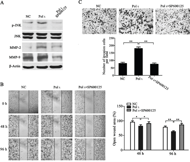 Figure 7: Pol ι promotes ESCC cell migration and invasion through the JNK-AP1 pathway. Pol ι overexpression cells were pretreated with SP600125 for 24h. A. western blot analysis of the expression levels of JNK, p-JNK, MMP-2 and MMP-9. B. wound-healing assay at 0, 48 and 96h after scratch. The open wound area was normalized to the area at the initial time (0 h, *p < 0.05, **p<0.01, Student’s t test). C. cells were plated in matrigel transwell inserts and incubated for 48h. Cells migrated to the bottom were stained with crystal violet and calculated manually (**p<0.01, Student’s t test).