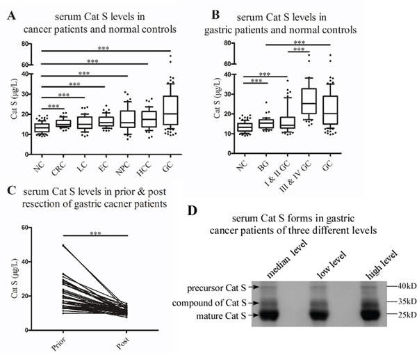 Higher levels of Cat S were detected in the serum of cancer patients, particularly the gastric cancer patients