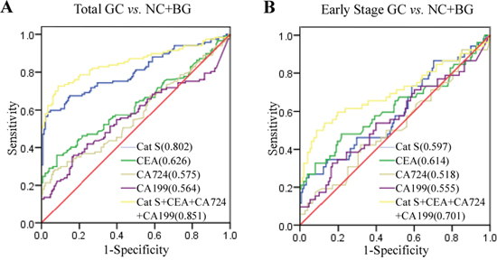Figure 2: Diagnostic value of serum Cat S in GC patients. Figures in the brackets were the AUCs from statistical analyses by SPSS software. A. The ROC curves demonstrated the diagnostic strength of Cat S, CEA, CA724, CA199 and a combination of four of them in identifying GC from controls (healthy controls and benign gastric diseases). B. The ROC curves of serum Cat S, CEA, CA724, CA199 and a combination of four of them in diagnosis of early stage GC against former controls.