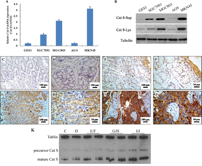 Figure 4: Cat S expression was up-regulated in GC cell lines and GC tissues. Cat S mRNA relative expression A. and protein levels from cell lysate and supernatant B. were compared between a panel of GC cell lines including SGC7091, MGC803, AGS and MKN45, and the immortalized normal human esophageal epithelial cell line, GES1. The mRNA levels are presented as means ± Sd. and normalized to the housekeeping gene GAPDH in qRT-PCR. The internal control was Tubulin in Western blotting. Representative Cat S immunohistochemistry staining in gastric tissues 100× C, D, E, G, I. and 200× F, H, J. C, D, E, F. Negative or weak positive expression of Cat S staining in the normal stomach. G, H. Intestinal type gastric cancer cells over expressed Cat S throughout the cytoplasm. I, J. Diffuse type gastric adenocarcinoma sections had cytoplasm positive staining of Cat S. K. Western blotting analysis of Cat S expression in tumor and normal stomach. The samples were in line with the immunohistochemistry tissue. There were only two bands, namely the precursor form (37kD) and the mature form (24kD). The internal control was Tubulin.