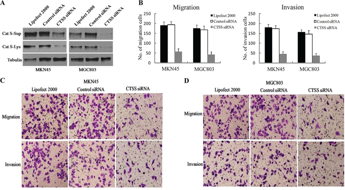 Figure 5: Knockdown of Cat S suppressed the migration and invasion of GC cells. A. Western blotting of cell lysate and supernatant from MKN45 and MGC803 cells transfected with NC or Cat S-targeting siRNAs, with Tublin as an internal control showed the effectiveness of Cat S knockdown by siRNA. B. Statistical graph of adherent cells presented as mean number±Sd. by triplet results of transwell migration and matrigel invasion assays. Representative staining images (× 100) of adherent cells in transwell migration assays and transwell matrigel invasion assays in MKN45 C. and MGC803 D. GC cell lines.