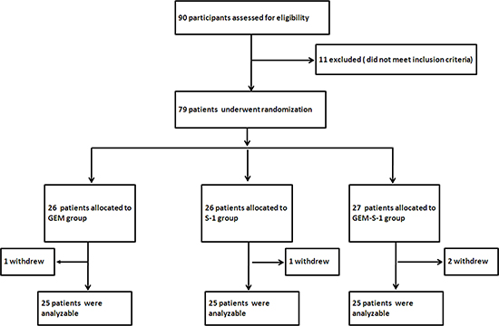 Figure 1: Patient selection flow chart. Seventy-five out of 79 patients completed the analysis, including 25 each in the GEM, S-1 and GEM-S-1 groups. GEM, gemcitabine; GEM-S-1, gemcitabine plus S-1.