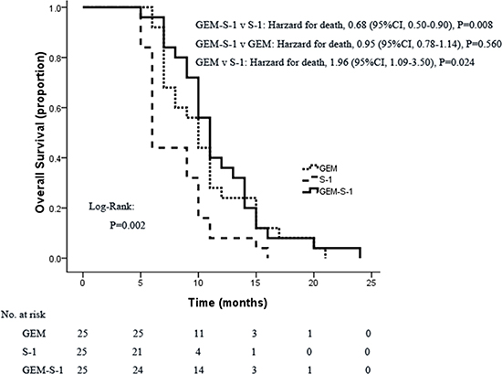 All patients were treated within a four-week cycle. GEM group individuals were administered 1000 mg/m2 GEM intravenously over 30 min on days 1, 8 and 15. Patients in the S-1 group were administered medication orally twice daily for 14 days, followed by a 14-day rest during each four-week cycle. Three doses of S-1 were used based on body surface area (BSA): BSA≤1.25 m2, 80 mg per day; 1.25 m2>BSA<1.5 m2, 100 mg per day; BSA≥1.5 m2, 120 mg per day. Patients randomly allocated to the GEM-S-1 group received 1000 mg/m2 GEM intravenously over 30 min on days 1 and 15 and S-1 orally twice daily for two weeks followed by a two-week rest during each four-week cycle. Treatments were carried out until disease progression (via either clinical or radiologic evidence), unacceptable toxicity or patient withdrawal occurred. In the case of predefined toxicity, assessment of adverse events and dose adjustments were permitted.