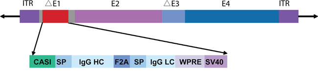 Figure 1: Full-length cetuximab antibody expression cassette. Schematic illustration of adenoviral vector with the expression cassette inserted at the E1 region. Antibody light and heavy chains, with separate signal peptides, are linked by F2A. The CASI promoter contains a portion of the CMV enhancer, a portion of the chicken β-actin promoter, and a portion of the UBC enhancer. HC, heavy chain; LC, light chain; SP, signal peptide; WPRE, woodchuck hepatitis virus posttranscriptional regulatory element.