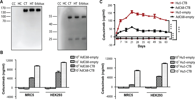 Figure 2: Ad-anti-EGFR antibodies expression in vivo and in vitro. A. Western blot analysis of Erbitux and supernatants from AdC68-CTB, and Hu5-CTB-infected HEK293 cells under non-reducing and reducing conditions. CC, AdC68-empty; CT, AdC68-CTB; HC, Hu5-empty; HT, Hu5-CTB. B. ELISA analysis of supernatants of AdC68-CTB and Hu5-CTB-infected HEK293 and MRC5 cells. The cells were infected with 1 × 108 vp or 1 × 107 vp AdC68-CTB or Hu5-CTB, respectively. Supernatants were harvested for protein analysis after 3 days. Data are based on three independent experiments. C. Anti-EGFR antibody expression level in the serum of immunodeficient mice. Mice were injected with 5 × 1010 vp adenovirus into muscles and bled at different time points. The serum anti-EGFR antibody concentrations were determined by sandwich ELISA. Statistical analysis was performed by one-way analysis of variance (ANOVA) with Tukey adjustment. Data are shown as mean ± SEM. *P < 0.05, **P < 0.01 and ***P < 0.001.