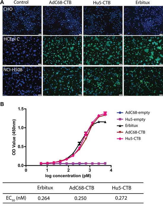 Figure 3: Biological activity of Ad-anti-EGFR antibodies. A. Specific binding of Ad-anti-EGFR antibodies. Three cell lines CHO (EGFR-), HCEpi C (EGFR+) and NCI-H508 (EGFR+) were selected for binding specificity determination. Ad-anti-EGFR antibodies in mouse serum were used. Erbitux was used as a positive control. Immunofluorescent microscopy analysis was performed for the specific binding of Ad-anti-EGFR antibodies to EGFR. Images are representative of three independent experiments. B. Affinity constant of Ad-anti-EGFR antibodies were determined by the EC50 values obtained from binding ELISA. The EC50 values of anti-EGFR antibody expressed by AdC68-CTB and Hu5-CTB and Erbitux were 0.250 nM, 0.272 nM, and 0.264 nM, respectively. Data are representative of at least three experiments.