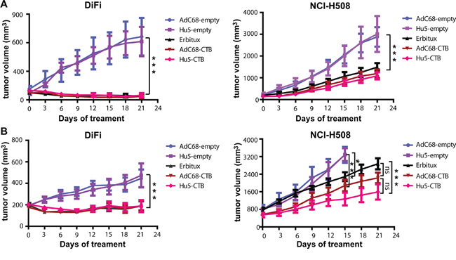 Figure 5: Intramuscular injection of AdC68-CTB or Hu5-CTB suppressed the growth of DiFi and NCI-H508 cells in nude mice. DiFi and NCI-H508 cells (1 × 107) were injected s.c. in the right dorsal flank of nude mice. After 6 days (A. early stage with smaller size) or 16 days (B. late stage with larger size), mice were treated with 5 × 1010 vp AdC68-empty, Hu5-empty, AdC68-CTB, Hu5-CTB or cetuximab (20 mg/kg, twice weekly). Development of tumors (mean ± SEM) was monitored using calipers every 3 days. Statistical analysis was performed by two-way ANOVA (*p < 0.05, **p < 0.01 and ***p < 0.001).