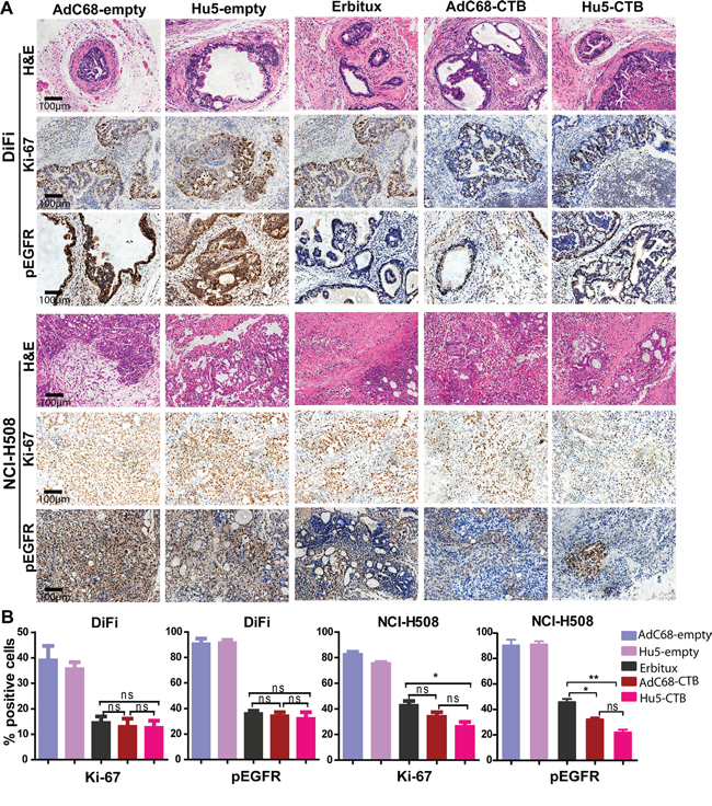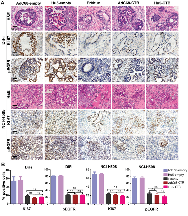 Figure 6: Ki-67 and pEGFR were reduced after treatment in early therapeutic strategy. Mice bearing colorectal carcinoma were treated with 5 × 1010 vp AdC68-empty, Hu5-empty, AdC68-CTB, Hu5-CTB or cetuximab (20 mg/kg, twice weekly) for 21 days, and tumor sections (n=10 per treatment group, n=6 for controls) were stained with Ki-67 and pEGFR. A. IHC photographs were representative fields from animals in each group. Scale bars, 100μm. B. The graphs shown the percentages of positively stained cells (control groups vs. treatment groups p < 0.001, except for Ki-67 in DiFi xenograft tumors p < 0.01). To semiquantify the Ki-67 and pEGFR-positive areas, three fields from each sample were randomly selected. Values are expressed as mean ± SEM. Statistical significance was assessed by one-way ANOVA with Tukey adjustment: *p < 0.05; **p < 0.01; ***p < 0.001; ns (not significant).