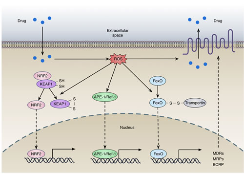 Redox resetting has been implicated in drug resistance at multiple levels, including elevated drug efflux, altered drug metabolism and mutated drug targets [10, 11]. In addition, ROS-induced activation of survival signaling pathways and inactivation of downstream death signaling pathways can lead to drug resistance (Figure 1) [1, 12, 13]. Here, we focus on the effects of redox resetting on drug resistance mechanisms and on current research efforts to reveal the detailed mechanisms of resistance to cancer therapies.