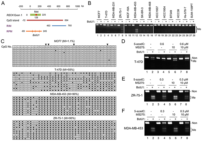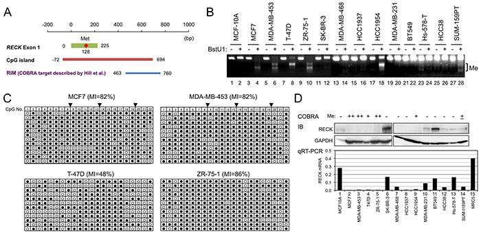 RECK, initially isolated as a transformation suppressor gene by cDNA-expression cloning, encodes a GPI-anchored glycoprotein with activities to downregulate or inhibit multiple metalloproteinases [13, 14]. Reduced RECK expression is found in various types of tumors, and the levels of residual RECK expression in tumors tend to correlate with better prognoses [15, 16]. In gene-focused studies, extensive methylation of RECK CpG island has been found in cancers of the colon, stomach, liver, and lung, and its correlation with poorer prognoses detected [17–22]. Importantly, in a non-biased, genome-wide methylation study, Hill and colleagues detected RECK as one of several loci whose methylation inversely correlated with relapse-free survival among breast cancer patients [5]. They employed an assay called Combined Bisulfite Restriction Analysis (COBRA) [23] for rapid detection of CpG methylation; in the case of RECK, they used a set of PCR primers amplifying an intron-1 region of its CpG island (see Figure 1A, bottom line). We refer to the methylation of this region “RIM” (RECK Intron-1 Methylation) in this paper to distinguish it from a newly examined region (see below).