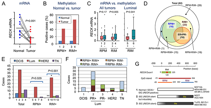 Figure 4: Statuses of RECK mRNA, RPM, and RIM in human breast tissues. A. RECK mRNA in normal and tumor tissues from the same patients (n=14). B. Proportions of RPM+ and RIM+ cases among the normal (blue) and tumor (red) tissues. C. Relationship between the status of RPM or RIM and the level of RECK mRNA. D. Relationship among breast cancer subgroups exhibiting different RPM/RIM statuses. Their relationship with ER+PR- tumors is also shown. E. Distribution of molecular subtypes [DCIS, luminal (Lum), HER2-enriched (HER2), and triple negative (TN)] among total (bars 1-4), RPM-positive (bars 5-8), or RIM-positive (bars 9-12) breast cancer cases. F. Distribution of tumors with different RPM/RIM statuses in each molecular subtype. G. Three classes of cells with different RPM/RIM statuses. [1] When RPM and RIM are negative, RECK is likely to be expressed, albeit at lower levels in tumors. [2] When methylation is confined to RIM, RECK is silent but inducible by MS275. [3] When both RPM and RIM are positive, RECK is silent and insensitive to MS275 unless the CpG island has been demethylated. Some cell lines of each class are listed on the right-hand side.