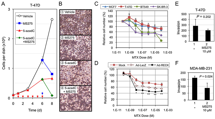 Figure 5: Effects of RECK-activation on the growth/survival of breast cancer cell lines. A, B. Effects of MS275, 5-azadC, or both on the growth/survival of T-47D cells. The cells (1×105/35-mm dish) plated on day 0 were incubated from day 1 to day 6 in growth medium or the medium containing 5-azadC (0.6 μM) with daily medium changes (red arrows), and then exposed to the same medium without or with MS275 (10 μM; blue arrow) from day 6 to day 8. Cell number was estimated by SF assay on day 1, 3, 6, and 8. Bar graph (A) represents mean ± s.e.m. (n=3). Representative micrographs at day 8 are also shown (B). C. Effects of MTX on four breast cancer cell lines. The cells were exposed to indicated concentrations of MTX for 48 h, and their number estimated by SF assay. The data represent mean ± s.e.m. (n=3). D. Effects of acute RECK expression on MTX-sensitivity of T-47D cells. T-47D cells were kept uninfected (Mock) or infected (MOI=600) with either control adenovirus (Ad-LacZ) or RECK-expressing virus (Ad-RECK). After 24 h, the cells were replated onto 96-well plates (1 × 104 cell/well), incubated for 16 h, exposed to MTX at various concentrations (0-10−4 M; triplicate) for 48 h, and then subjected to SF assay. Data (mean±SD) are presented as their ratios to the vehicle-treated controls. E, F. Effects of MS275 on Matrigel invasion of T-47D (E; 20-h incubation) or MDA-MB-231 cells (F; 16-h incubation). The graph represents mean±s.e.m. (n=3).