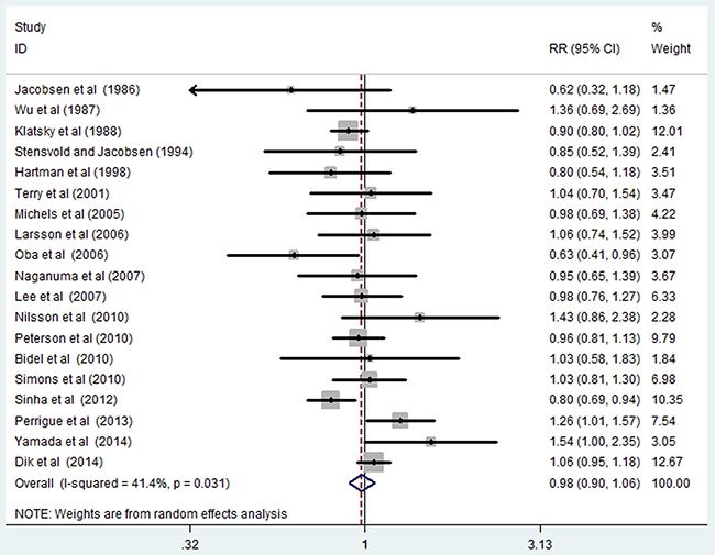 Fifteen studies [13, 15-20, 22, 23, 25-28, 30, 31] were included in the analysis of high versus low intake of coffee and rectal cancer risk. The pooled RR of rectal cancer was 1.06 (95% CI, 0.95–1.19), with a low heterogeneity (I2=13.00%; P=0.308; Supplemental Figure S1).
