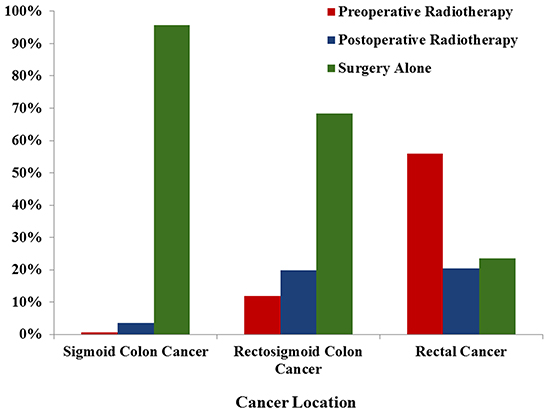 Colorectal cancer was the third most common cancer for both men and women over the world [1]. Currently, there has been obvious improvement for the outcome of patients with colorectal cancer due to the refinement of therapy modalities. Radiotherapy has been widely used to improve both local control and long-term survival for patients with locally advanced rectal cancer (RC), especially for the lower and middle RC [2, 3]. On the contrary, substantial evidences have suggested that radiotherapy is not beneficial to improve the outcomes for patients with colon cancer (CC). Therefore, radical colectomy without radiotherapy was generally recommended to treat patients with CC [4].