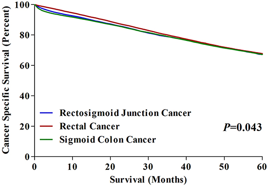 Although rectosigmoid junction was anatomically deemed as distal segment of sigmoid colon, some argued that it should be one part of rectum in consideration that it shared with crucial vascular system with the rectum above peritoneal reflection [5]. In fact, International Classification of Diseases for Oncology, Third Edition (ICD-O-3) recently noted that the rectosigmoid junction should be classified as one independent segment of large intestine (ICD-O; C-19), instead of categorizing it as colon (ICD-O; C-18) or rectum (ICD-O; C-20). The cancers at the rectosigmoid junction (RSC) should be therapeutically different from both CC and RC regarding to its special location. Actually, the role of pre- or postoperative radiotherapy in treatment of RSC still remains in suspense.