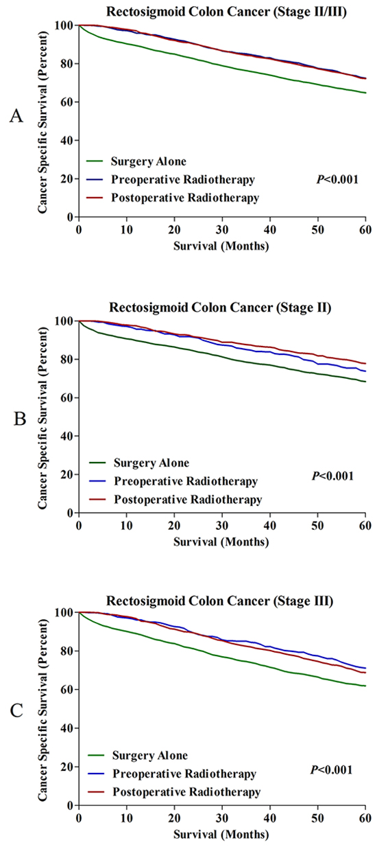 To our best knowledge, there is no available large population based evidence to confirm the effect of radiotherapy on locally advanced RSC based on the long-term outcomes. To address this issue, we assessed the long-term efficacy of radiotherapy for RSC according to different therapeutic strategies. Moreover, we also conducted a large-scale retrospective study to investigate the prognostic value of radiotherapy for sigmoid colon cancer (SC) and RC.