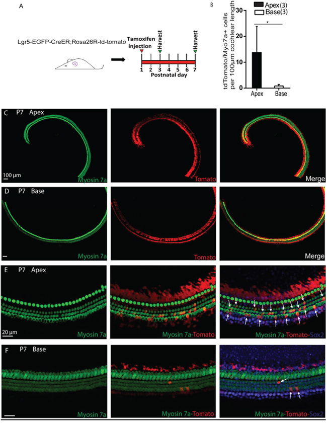 Lgr5-EGFP-creER mice (heterozygous) were crossed with Rosa26-tdTomato mice (homozygous) to trace the fate of Lgr5+ cells in the apical and basal turns of the cochlea. To activate cre, Lgr5-EGFP-creER/Rosa26-tdTomato double-positive mice were injected with tamoxifen (2 mg/25 g, Sigma) intraperitoneally at postnatal day (P)1. Mice were sacrificed, and the cochlear apex and base were examined at P3 and P7.