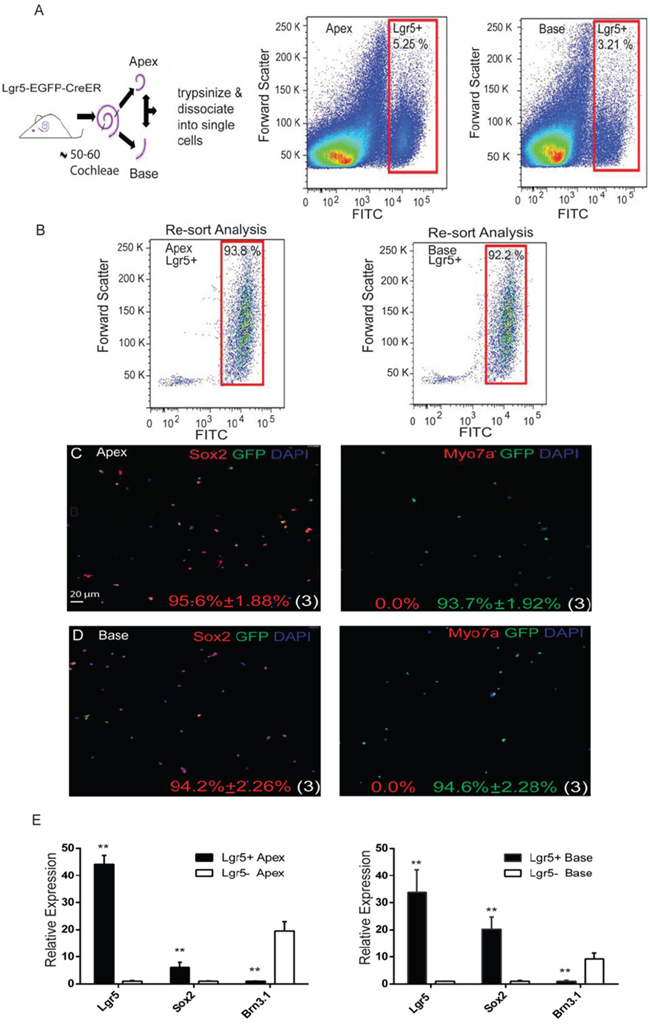 Figure 2: Re-sort analysis, immunostaining, and quantitative PCR of flow-sorted Lgr5+ cells from the apical and basal turns of the postnatal cochlea. A. Lgr5-EGFP-CreER cochleae were dissected and separated into apical and basal fractions, and GFP+ and GFP− cells from each fraction were sorted by flow cytometry. B. Re-sort analysis of ALPs and BLPs demonstrated >90% purity. C. Immediate immunostaining after sorting of Lgr5+ cells from the apex showed a high percentage of Sox2+ (95.6%) and GFP+ (93%) cells but no Myo7a+ cells (0.0%). D. Immunostaining of Lgr5+ cells from the base also showed a high percentage of Sox2+ (94.2%) and GFP+ (94.6%) cells, and no Myo7a+ (0.0%) cells were found in the sorted cells. E. Quantitative PCR results showed the relative expression of Lgr5, Sox2, and Brn3.1 in ALPs and BLPs.