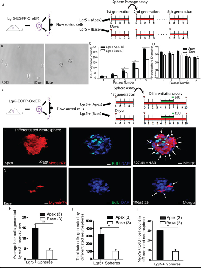 Figure 5: Neurosphere passage and differentiation assay. A. Flow-sorted apical and basal Lgr5+ cells cultured for 5 days in ultra-low-attachment dishes for sphere passage assay. B. Lgr5+ cells from the apex generated significantly more neurospheres than those from the base. C. Neurospheres from Lgr5+ cells in the apex had a significantly higher rate of expansion than those from the base. D. No significant difference was observed in the diameter of neurospheres generated from Lgr5+ cells from the apex as compared to the base. E. Neurospheres derived from ALPs and BLPs were separated from the first generation to perform the differentiation assay. F. Upon differentiation of Lgr5+ neurospheres from the apex, a substantial proportion of Myo7a+ cells (arrows) were observed that also incorporated EdU (arrowhead). G. A smaller number of Myo7a+ cells (arrow) were observed upon differentiation of basal Lgr5+ neurospheres. H. Each Lgr5+ differentiated neurosphere from the apex generated significantly more Myo7a+ HCs than the base. I. Graph showing the significant difference in HC generation between apical and basal Lgr5+ neurospheres. J. More Myo7a+/EdU+ cells were found in differentiated neurospheres from the apex compared to the base. Data are presented as mean ± SD. In panels C, D, and G-I, n is shown in parentheses. *p < 0.05; **p < 0.01. Scale bars are 50 μm in B and 20 μm in E and F.