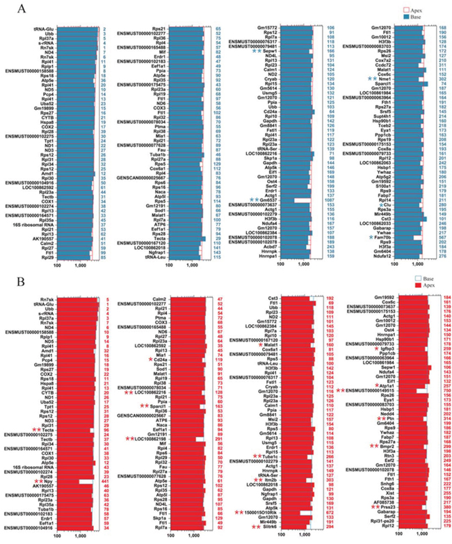 Figure 6: Expression levels of the top 200 genes in ALPs and BLPs. A. Expression levels of the top 200 genes in ALPs in descending order. Numbers in blue on the right side of each panel represent the ranking of the same genes in BLPs. B. Expression levels of the top 200 genes in BLPs in descending order. Numbers in red on the right side of each panel represent the ranking of the same genes in ALPs.