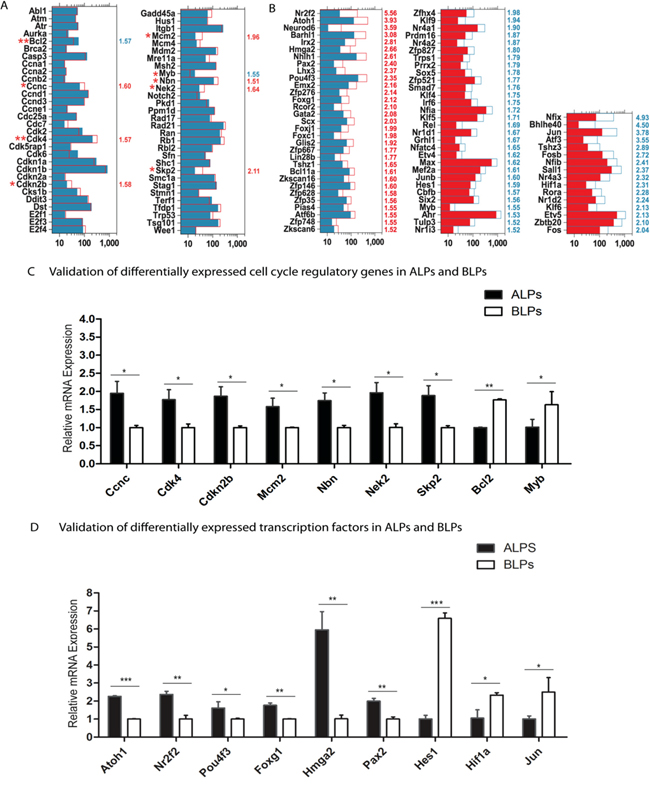 Figure 8: Genes regulating the cell cycle and transcription factors. A. Expression levels of 60 genes that are important for cell cycle regulation. B. Expression levels of differentially expressed transcription factors. C and D. Quantitative RT-PCR analysis of the nine cell cycle regulatory genes and the nine transcription factors that are differentially highly expressed in ALPs and BLPs as identified by microarray analysis. Data are presented as the relative fold change in expression. Student’s paired t-test; *p < 0.05; **p < 0.01; ***p < 0.001.