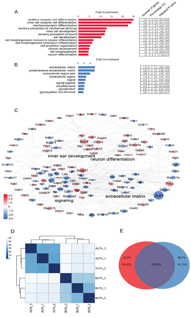 Microarray analysis was performed to determine the gene expression profiles of flow cytometry-isolated ALPs and BLPs. The whole-transcript arrays included probe sets to measure the expression of mRNA and non-coding RNA transcripts. The 41,345 transcriptional units had fluorescent intensity readings that varied from 2.61 to 11,869.65 for ALPs and from 2.74 to 11,903.02 for BLPs. Because the expression of every transcriptional unit was measured by signal intensity, a cutoff baseline intensity level for the background was chosen as 16.3 by averaging the signals of antigenomic background probes from all six arrays. Sample clustering analysis was performed on genes expressed in at least one group to assess reproducibility. ALP and BLP groups were well clustered, and no outliers were detected (Figure 9D). After excluding control sequences and signals below the baseline, 16,375 and 16,125 transcripts were examined in the ALP and BLP groups, respectively, and 15,525 transcripts were expressed in both cell populations (Figure 9E).