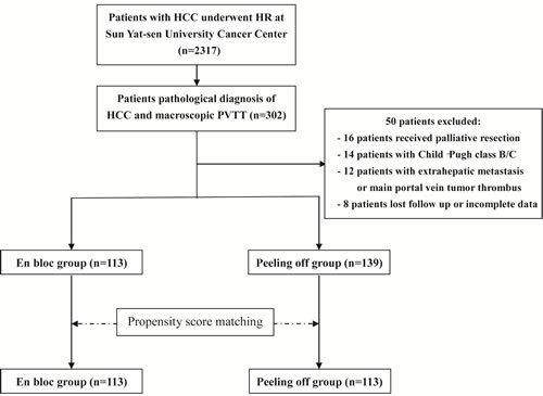 A total of 2,317 patients with HCC underwent hepatic resection at Sun Yat-sen University Cancer Center between 2005 and 2012. Three hundred and two patients had evidence of macroscopic vascular invasion and underwent primary resection. 50 patients did not fulfill the inclusion criteria and were excluded from the study. In the end, 252 patients (113 patients in the en bloc group and 139 patients in the peeling off group) were enrolled in the study (Figure 1).