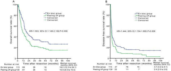 The demographic, preoperative and tumor variables were compared between the peeling off and en bloc groups. The operative approach was not randomly assigned; thus, there was a potential for confounding and selection bias between the two groups. Therefore, propensity score matching was conducted prior to comparisons of OS and DFS between the peeling off and the en bloc propensity score-matched groups.