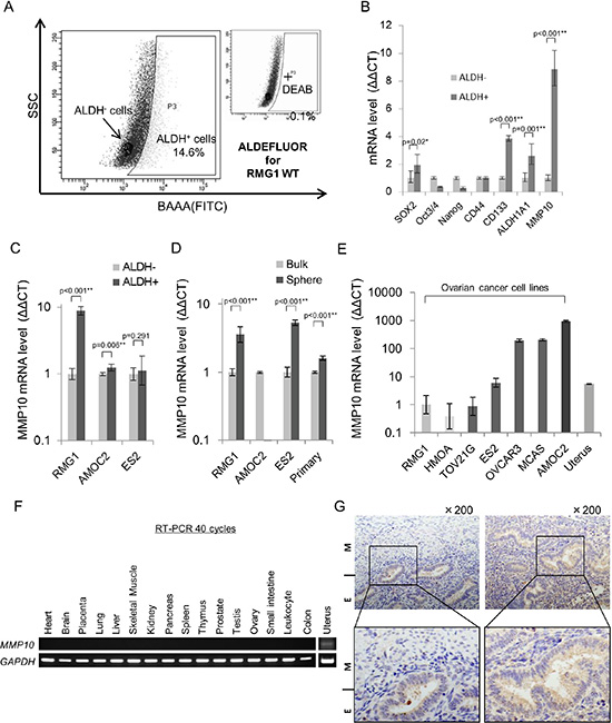 Figure 1: MMP10 expression in ovarian cancer and normal organs. (A) ALDEFLUOR assay for RMG1 cell line. (B) Expression of stem cell-related genes in ALDH+/− cells. Expression levels of stem cell-related genes and MMP10 were determined by quantitative PCR, and differences between ALDH+ and ALDH- cells were determined by using the ΔΔCT method. Data are shown as means ± SD. (C). MMP10 gene expression level in ALDH+/− cells. Gene expression level of MMP10 was determined by quantitative PCR, and the difference between ALDH+ an ALDH- cells of each cell line, RMG1, AMOC2 and ES2, was determined by using the ΔΔCT method. Data are shown as means ± SD. (D) MMP10 gene expression levels in bulk and sphere cells. Gene expression levels of MMP10 were determined by quantitative PCR, and the difference between bulk cells (adherent culture cells) and sphere cells (7 days of culture in a sphere-forming conditioned medium) of each cell line, RMG1, AMOC2, ES2 and primary clear cell adenocarcinoma cells, was determined by using the ΔΔCT method. Data are shown as means ± SD. (E) MMP10 gene expression levels in cell lines and the uterus. We compared MMP10 gene expression levels in the cell lines and in uterus cDNA. RMG1 was used for a control, and the ΔΔCT method was performed. Data are shown as means ± SD. (F) MMP10 gene expression levels in normal organs. (G) Immunohistochemical staining of the myometrium and endometrium in the normal uterus for MMP10. The figures on the left are the uterus with an endometrium (E) lesion and a myometrium (M) lesion. The figures on the right are the endometrium of the uterus (upper panel: × 200 magnification, lower panel: enlarged image). All statistical analyses for this figure were performed using bilateral Student’s t test. P-values are shown as follows: *< 0.05, **< 0.01.