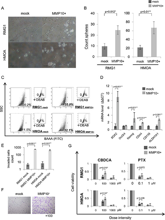 Figure 2: Phenotypes of MMP10-overexpressed cells. (A) Sphere formation of mock- and MMP10-transfected cells. Seven-day-cultured mock- and MMP10-transfected cells of RMG1 (upper) and HMOA (lower) cell lines under × 100 magnification light microscopic view. Bar scales are 100 μm. (B) Sphere-forming assay for mock- and MMP10-transfected cells. Data are shown as means ± SD. (C) ALDEFLUOR assay of mock- and MMP10-transfected cell lines. (D) Expression of stem cell-related genes in mock- and MMP10-transfected cells. Expression levels of stem cell-related genes were examined by quantitative PCR using the ΔΔCT method. Significantly up-regulated genes in MMP10-transfected cells are shown in the figure. Data are shown as means ± SD. (E-F) Matrigel invasion assay for mock- and MMP10-transfected cell lines. Numbers of mock- and MMP10-transfected cells in each of the cell lines, RMG1 and HMOA, are listed in bar graphs in figure E. Data are shown as means ± SD. In figure F, HE-stained membranes of tested columns are shown in ×100 magnification. (G) Resistance of mock- and MMP10-transfected cells to chemotherapeutic agents. Calculated cell viability after 48 hrs of treatment with paclitaxel (PTX) and carboplatin (CBDCA) is shown in bar graphs. X-axis is dose intensity of each agent. Y-axis is calculated cell viability from counted number of surviving cells. Data are shown as means ± SD. All statistical analyses for this Figure were performed using bilateral Student’s t test. P-values are shown as follows: *< 0.05, **< 0.01.