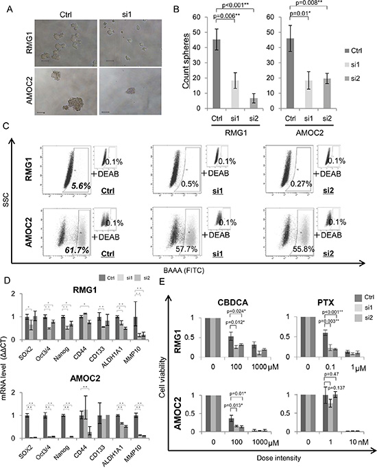 Figure 3: Phenotypes of MMP10 knockdown cells. (A) Sphere formation of MMP10 knockdown cells. Seven-day-cultured MMP10 knockdown cells of RMG1 (upper) and AMOC2 (lower) cell lines under × 100 magnification light microscopic view. Bar scales are 100 μm. (B) Sphere-forming assay of MMP10 knockdown cells. Data are shown as means ± SD. (C) ALDEFLUOR assay for MMP10 knockdown cell lines. (D) Expression of stem cell-related genes in MMP10 knockdown cells. Expression levels of stem cell-related genes were examined by quantitative PCR using the ΔΔCT method. Data are shown as means ± SD. (E) Resistance of mock and MMP10-overexpressed cells to chemotherapeutic. Calculated cell viability after 48 h of treatment with paclitaxel (PTX) and carboplatin (CBDCA) is shown in bar graphs. X-axis is dose intensity of each agent. Y-axis is calculated cell viability from the counted number of surviving cells. Data are shown as means ± SD. All statistical analyses for this Figure were performed using bilateral Student’s t test. P-values are shown as follows: *< 0.05, **< 0.01.