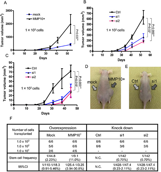 Figure 4: Tumorigenicity in vivo xenograft and limiting dilution assay. (A-C) Tumor growth curves of cells injected into nude mice. Tumor volume in mice in which cells had been injected was checked every week. A: mock and MMP10-overexpressed cells, 1 × 103 cells injected. (B) Ctrl, si1 and si2 cells, 1 × 103 cells injected. (C) Ctrl, si1 and si2 cells, 1 × 102 cells injected. X-axis is the number of days and Y-axis is tumor volume (mm3). Data are shown as means ± SD. (D, E) Pictures of injected tumors 1 × 103 cells and a mouse. (F) Numbers of tumors generated and results of limiting dilution assay. Numbers of tumors generated by the cell lines are shown in table. Stem cell frequencies and 95% confidence intervals were calculated using ELDA as described in experimental procedures. All statistical analyses for this Figure were performed using bilateral Student’s t test. P-values are shown as follows: *< 0.05, **< 0.01.