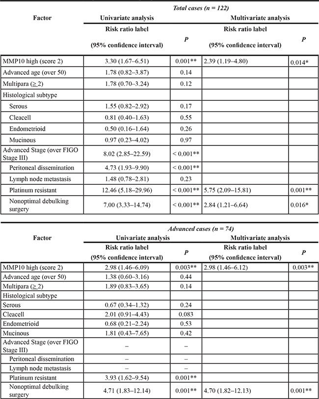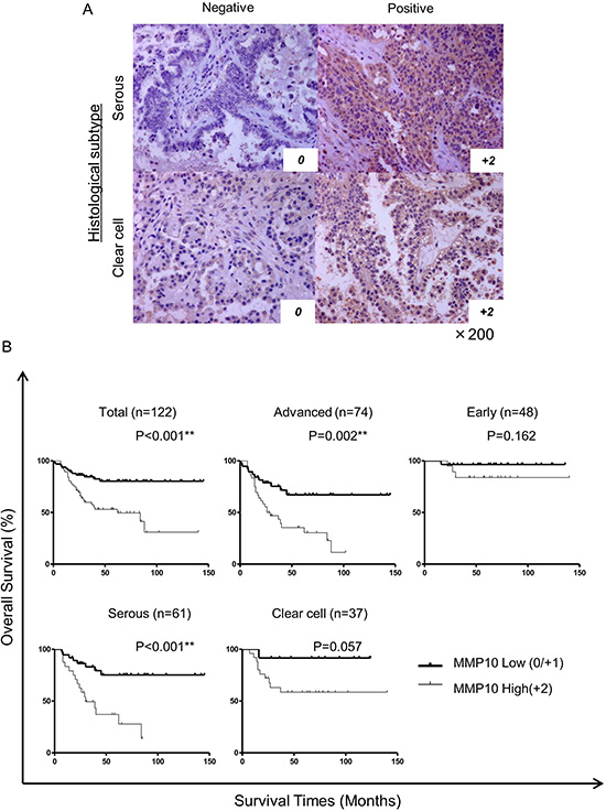 Figure 6: Immunohistochemical staining of clinical samples and statistical analysis. (A) Immunohistochemically stained ovarian cancer specimens. Clinical specimens stained immunohistochemically using MMP10 antibody and HE for counter staining. All magnifications are ×200. (B) Kaplan-Meier curves for overall survival of all cases. The cases were analyzed by expression of MMP10. Total cases: n = 122, advanced cases: n = 74, early cases: n = 48, serous adenocarcinoma cases: n = 61 and clear cell adenocarcinoma cases: n = 37. Differences in survival curves were analyzed using the log-rank test. P-values are shown as follows: *< 0.05, **< 0.01.