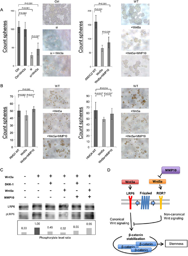 To explore the molecular mechanisms how extracellular MMP10 increase the stemness, we analyzed the Wnt signaling that is known as stem cell-related signaling pathway [21]. A recent study revealed that MMP3 activate canonical Wnt signaling by inhibition of noncanonical Wnt signaling ligand, Wnt5b [22]. A previous study revealed that a Wnt5b orthologue Wnt5a suppress ovarian cancer cells [23], and our data revealed that Wnt5a showed relative higher expression in ovarian cancer cells than that of Wnt5b (data not shown). We therefore analyzed the functions of canonical Wnt signaling ligand Wnt3a and noncanonical Wnt signaling ligand Wnt5a. Wnt3a significantly increased the sphere-forming ability of AMOC2 cells that are transfected with MMP10 siRNA (Figure 7A). On the other hand, Wnt5a significantly decreased the sphere-forming ability of AMOC2 cells (Figure 7A). The decrease of sphere-forming ability by Wnt5a was partially cancelled by MMP10 (Figure 7A). This results suggest that activation of canonical Wnt signaling has a role in sphere-forming and activation of noncanonical Wnt signaling inhibit sphere-forming. To generalize these observation, we performed experiments using additional two cell lines RMG1 and HMOA. The sphere-forming were inhibited by Wnt5a, and it could be cancelled by MMP10 (Figure 7B).