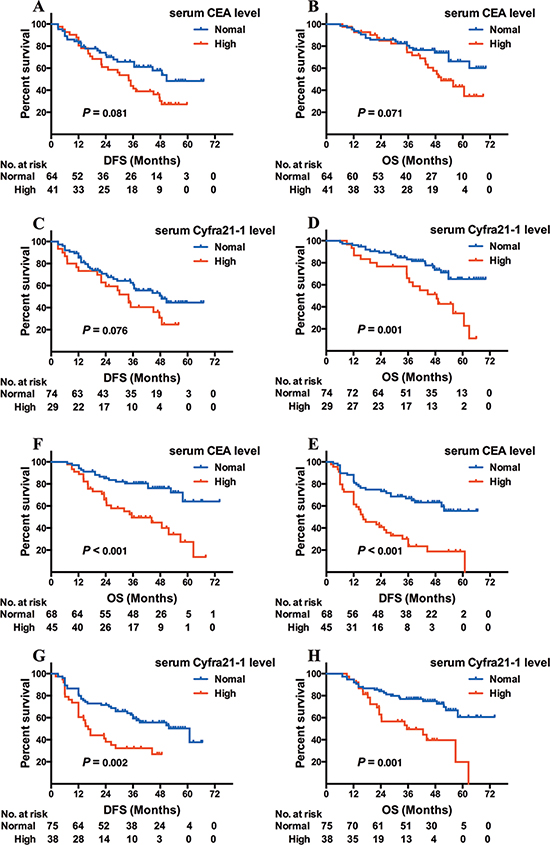 Serum Cyfra21-1 in 27 non-adenocarcinoma EGFR-mutated patients was significantly higher than in 218 EGFR-mutated adenocarcinoma cases (median: 3.91 versus 2.50 ng/ml, P = 0.014). Among the non-adenocarcinoma patients, those with elevated Cyfra21-1 had shorter DFS and OS compared to normal Cyfra21-1 cases (median DFS, 13.2 versus 22.0 months; median OS, 23.4 versus 39.6 months), especially among the 15 squamous cell carcinoma patients, 9 cases with elevated Cyfra21-1 had shorter DFS and OS compared to those with normal Cyfra21-1 levels (median DFS, 13.2 versus 24.0 months; median OS, 18.3 versus 43.7 months). Serum SCCA levels were not different between squamous cell carcinoma patients with or without EGFR mutations, nor did it have a relationship with DFS or OS.
