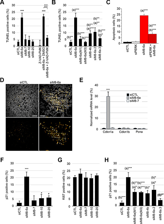 Figure 3: Silencing of sM8 isoforms induces apoptosis and increases p21 positive cell population of prostate cancer cells. (A) Terminal deoxynucleotidyl transferase dUTP nick end labeling (TUNEL) reaction was performed on LNCaP C4-2b cells with nucleotide coupled to tetramethyl rhodamine (TMR) before cell counting was achieved by flow cytometry. Graph plot represents the proportion of apoptotic cells. This reveals an induction of apoptosis after a 3-day transfection with siRNA targeting TRPM8 exon 6a. No significant variation of apoptosis is detected with other anti-TRPM8 siRNA (siM8-7, siM8-10, siM8-20) compared to the control siRNA (siLuc). This induction of apoptosis is strongly reduced in cells treated with the general inhibitor of caspases: Z-VAD-FMK. (B) Percentage of apoptotic cells is increased by transfection of other siRNA targeting other exons of sM8s other than exon 6a, while mutants of the siM8-6a siRNA failed to trigger apoptosis. Statistical test with siCTL: (a), and with siM8-6a: (b). (C) The concomitant suppression of PERK (siPERK) and sM8s (siM8-6a) decrease sM8 KD-induced apoptosis by 66% in LNCaP C4-2b cells. Cells were stained with Hoechst and the count of apoptotic nuclei was normalized by the count of total nuclei. Statistical test with siCTL: (a), and with siPERK: (b). (D) TUNEL reports the detection of apoptotic cells in subcutaneous LNCaP C4-2b tumors. Left panels show tumors in mice injected with CTL siRNA and right panels show low growth rate tumors developed in siM8-6a-injected mice. Top panels are merges of autofluorescence image (excited at 488 nm, gray scale image) and TUNEL images (excited at 633nm), while bottom panels only show TUNEL signal (Orange Hot LUT). Scale bars: 30 μm. (E) Gene expression was estimated with real time PCR after a 3-day siRNA transfection of LNCaP C4-2b cells. Panel shows genes coding for cell cycle inhibitor p21 and p27kip (respectively CDKN1A and CDKN1B), and the PCNA gene coding for the proliferating cell nuclear antigen, which is expressed during cell cycle. (F) and (G), show an increase in the proportion of p21 and Ki67 positive cells, respectively, after transfection of cells with siRNA targeting different groups of TRPM8 isoforms. Cells were sorted by flow cytometry after immunolabeling of p21 (Alexa647) and Ki67 (Alexa488) proteins. (H) The specificity of sM8 KD-induced p21 expression was assessed by the use of alternate siRNA, as described in B. The proportion of p21 immunolabeled cells was counted as explained in F. Experiments were performed three times independently. Values are expressed as Mean ± SD.