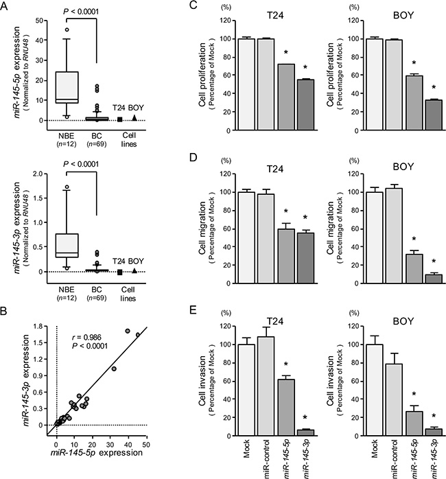 Figure 1: The expression levels of miR-145-5p and miR-145-3p, and their effects in BC cells. (A) Expression levels of miR- 145- 5p and miR-145-3p in clinical specimens and BC cell lines were determined by qRT-PCR. Data were normalized to RNU48 expression. (B) Correlation of miR-145-5p and miR-145-3p expression. (C) Cell growth was determined by XTT assays 72 hours after transfection with 10 nM miR-145-5p or miR-145-3p. *P < 0.0001. (D) Cell migration activity was determined by the wound-healing assays. *P < 0.0001. (E) Cell invasion activity was determined using Matrigel invasion assays. *P < 0.0001.