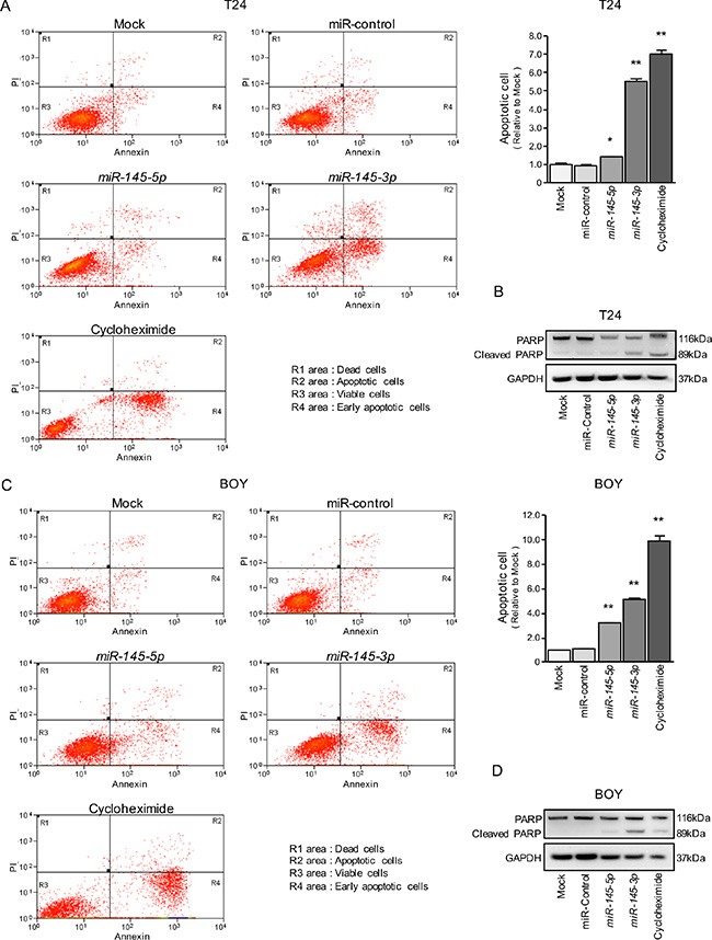 Figure 2: Effects of miR-145-5p and miR-145-3p on apoptosis. (A, C) Apoptosis assays were carried out using flow cytometry. Early apoptotic cells are in area R4 and apoptotic cells are in area R2. The normalized ratios of apoptotic cells are shown in the histograms. Cycloheximide (2 μg/mL) was used as positive control. *P = 0.0266 and **P < 0.0001. (B, D) Western blot analyses for apoptotic markers (cleaved PARP) in BC cell lines. GAPDH was used as a loading control.