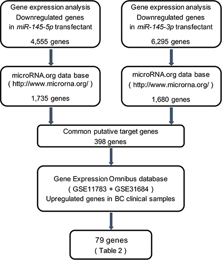 Figure 3: Flow chart illustrates the strategy for analysis of miR-145-5p and miR-145-3p target genes. A total of 4,555 and 6,295 downregulated genes in expression analysis of miR-145-5p and miR-145-3p transfected BC cell lines, respectively, (T24 and BOY) were selected as putative target genes. Next we merged the data of those selected genes and the microRNA.org database. The analyses showed 398 common putative target genes between miR-145-5p and miR-145-3p. We then analyzed gene expression with available GEO data sets (GSE11783 + GSE31684). The analyses showed that 79 genes were significantly upregulated in BC specimens compared with NBE.
