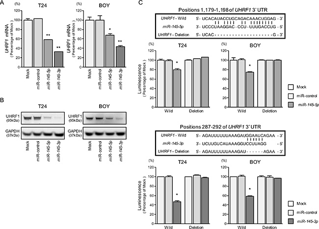Figure 4: Direct regulation of UHRF1 by miR-145-5p and miR-145-3p. (A) UHRF1 mRNA expression was evaluated by qRT-PCR in T24 and BOY 72 hours after transfection with miR-145-5p and miR-145-3p. GUSB was used as an internal control. *P = 0.0036 and **P < 0.0001. (B) UHRF1 protein expression was evaluated by Western blot analyses in T24 and BOY 72–96 hours after transfection with miR-145-5p or miR-145-3p. GAPDH was used as a loading control. (C) miR-145-5p and miR-145-3p binding sites in the 3′ UTR of UHRF1 mRNA. Dual Luciferase reporter assays using vectors encoding putative miR-145-5p and miR-145-3p target sites of the UHRF 3′ UTR (positions 1,179–1,198 and 287–292, respectively) for both wild-type and deleted regions. Normalized data were calculated as ratios of Renilla/firefly luciferase activities. *P < 0.0001.