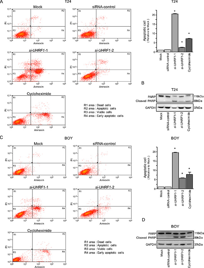 Figure 6: Effects of silencing UHRF1 on apoptosis in BC cell lines. (A, C) Apoptosis assays were carried out using flow cytometry. Early apoptotic cells are in area R4 and apoptotic cells are in area R2. The normalized ratios of the apoptotic cells are shown in the histogram. Cycloheximide (2 μg/mL) was used as a positive control. *P < 0.0001 (B, D) Western blot analyses for apoptotic markers (cleaved PARP) in BC cell lines. GAPDH was used as a loading control.