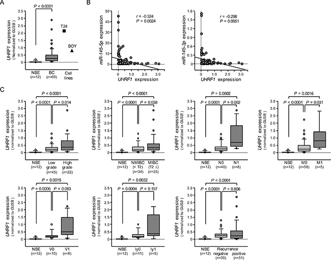 Figure 7: The expression level of UHRF1 mRNA in BC clinical specimens and cell lines, and association of UHRF1 expression with clinicopathological parameters. (A) Expression levels of UHRF1 in clinical specimens and BC cell lines were determined by qRT-PCR. Data were normalized to GUSB expression. (B) The correlated expression among miR-145-5p, miR-145-3p, and UHRF1. (C) Association of UHRF1 expression with clinicopathological parameters. Relationships between two variables were analyzed using the Mann-Whitney U test.