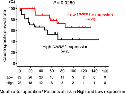 Figure 8: The association between the expression level of UHRF1 and cause specific survival rate. Kaplan-Meier survival curves for cause specific survival rates based on UHRF1 expression in 57 BC patients. P-values were calculated using the log-rank test.