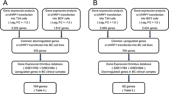 To investigate molecular targets regulated by UHRF1 in BC cells, we carried out gene expression analyses using si-UHRF1-transfected BC cell lines. Microarray data were used for expression profiling of si-UHRF1 transfectants. The microarray data were deposited into GEO (accession number: GSE77790). We analyzed common down or upregulated genes using the GEO dataset. The flow chart outlining the investigation of UHRF1 downstream genes is shown in Figure 10A and 10B.
