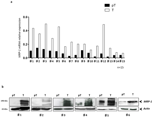 Figure 2: The MRP-1 is highly expressed in tumor tissues of HCC patients. Total mRNA and proteins were extracted from freshly resected samples obtained from HCC patients (n=15) and MRP-1 expression was evaluated by qRT-PCR and WB. a. The MRP-1 mRNA level in each patient was shown; b. the MRP-1 protein (190 kDa) was detected by Western blot using specific anti-MRP-1 antibody in primary HCC samples in tumor (T) and peri-tumor (pT) areas from 6 patients with HCC.