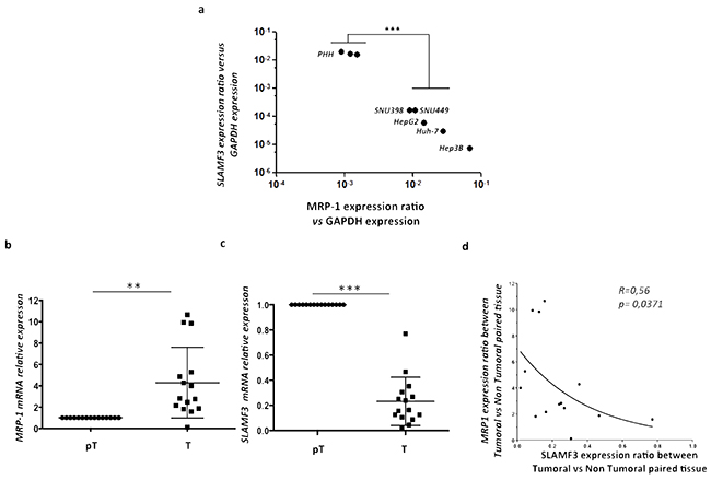 Figure 3: Inverse correlation between SLAMF3 and MRP-1 expression in HCC cell lines and primary hepatocytes. Total mRNA from primary healthy hepatocytes PHH and different hepatocyte cancerous cell lines (Huh-7, HepG2, Hep3B, SNU398 and SNU449) was extracted and SLAMF3 and MRP-1 mRNA expression was quantified by qRT-PCR a. Transcripts were standardized by GAPDH quantification used as control. Results were presented as the mean of six independent experiments ± SD (n=6, ***p<0.001); b, c. MRP-1 and SLAMF3 mRNA, respectively, expression were analyzed in same extract from resected HCC patients by qRT-PCR. The mRNA quantities were compared between tumor (T) and peri-tumor (pT) areas and results presented as median, *p<0.05 for MRP-1 and ***p<0.005 for SLAMF3. The correlation between SLAMF3 and MRP-1 expressions was evaluated and represented as curve d. R= 0.56 and * p<0.05.