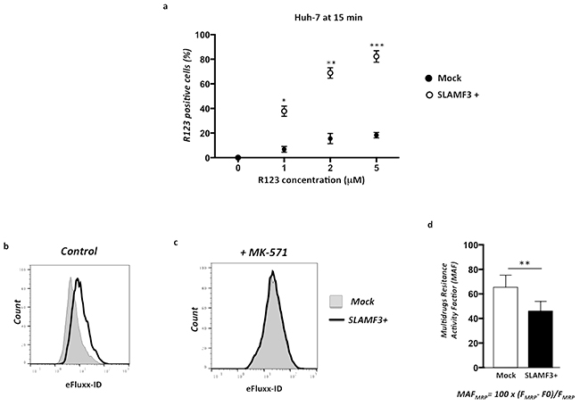 Figure 4: Overexpression of SLAMF3 in HCC cells blocks specifically MRP-1 function. Cells transfected with SLAMF3 plasmid (SLAMF3+) and mock plasmid (2×106/assay) were incubated with Rhodamine (R123) at 1, 2 and 5 mM for 15 minutes and R123 fluorescence measured in a flow cytometer by gating SLAMF3+ and mock. a. Results are presented as the mean ± SD from 3 independent experiments (n = 3; * p< 0.05, **p<0.01, ***p<0.005). The MRP-1 activity was specifically measured by using eFluxx-ID® Gold multidrug resistance assay kit (NZ-51030). Unless the eFluxx-ID® dye is pumped out of the cell, the esterase cleaved dye is trapped inside the cell. Cells exhibiting drug resistance will have diminished fluorescence. Cells (mock and SLAMF3+) were incubated with Gold detection reagent with and without specific inhibitor of MRP-1 (MK-571) for 30 min in 37°C and suspended in cold PBS for flow cytometry analysis. Fluorescence of gold dye(eFluxx-ID) is measured and presented as histogramsin mock (dotted line, full) and in SLAMF3 overexpressing cells SLAMF3+ (bold line, empty) in untreated cells b. and in the presence of MRP-1 specific inhibitor MK-571 c. One representative experiment from three (n=3) is presented. The formula of calculation of multidrug resistance activity factor (MAF) as: MAFMRP= 100 x (FMRP-F0)/FMRP where FMRP corresponds to the fluorescence intensity in the presence of MRP-1 specific inhibitor MK-571 and F0 to the fluorescence intensity in absence of inhibitor. Calculated MAF is presented d. as the mean ± SD from 3 independent experiments (n = 3; **p<0.01).