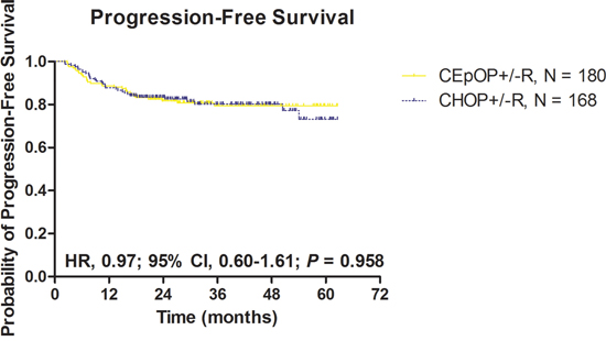 Here, we compared two anthracycline-based regimens with or without rituximab and demonstrated that epirubicin (70 mg/m2) was equivalent to doxorubicin (50 mg/m2) in terms of anti-tumor activity. Additionally, the risk of decreased LVEF after 4 cycles of cheomtherapy did not differ between patients treated with CEpOP+/-R and those treated with CHOP+/-R.